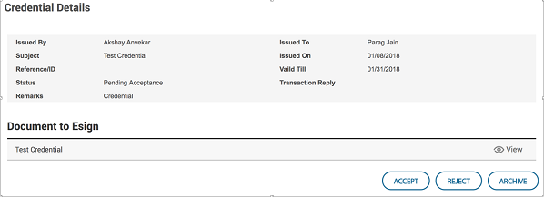- Click on the alert to view details of the credentials and view the credential itself. Once satisfied with the credential, click on ‘Accept’ to add to your CT.Com profile