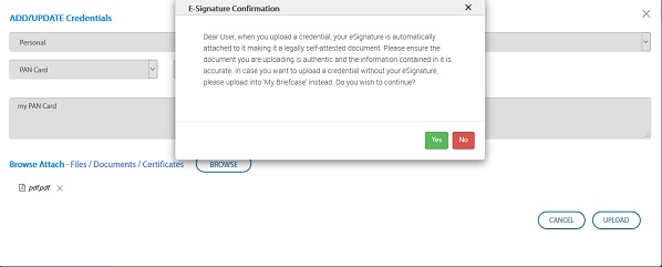 You can eSign and upload your credentials (offer letters, certificates, salary slips, letters etc) into your CT.Com. Please make sure your credential is in .PDF format and size of the file is no more than 2MB.