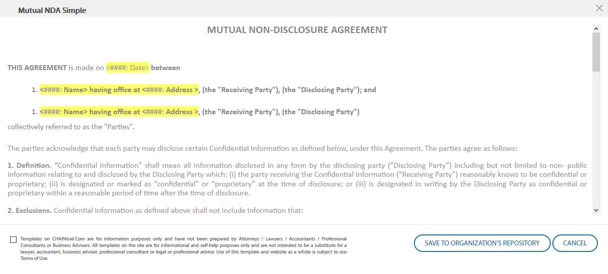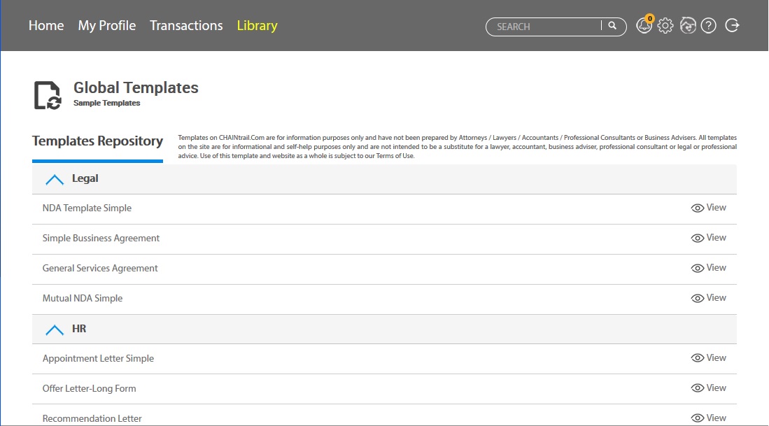 The global template library can be accessed only by the administrator of an orga nization. It is a library of action and document templates (NDAs, Offer Letters etc) that any organization can use by editing and customizing to their specific needs. The administrator can pick and template they want to use and copy into Organization’ s Repository where these are editable and visible to all employees for transacting purposes.