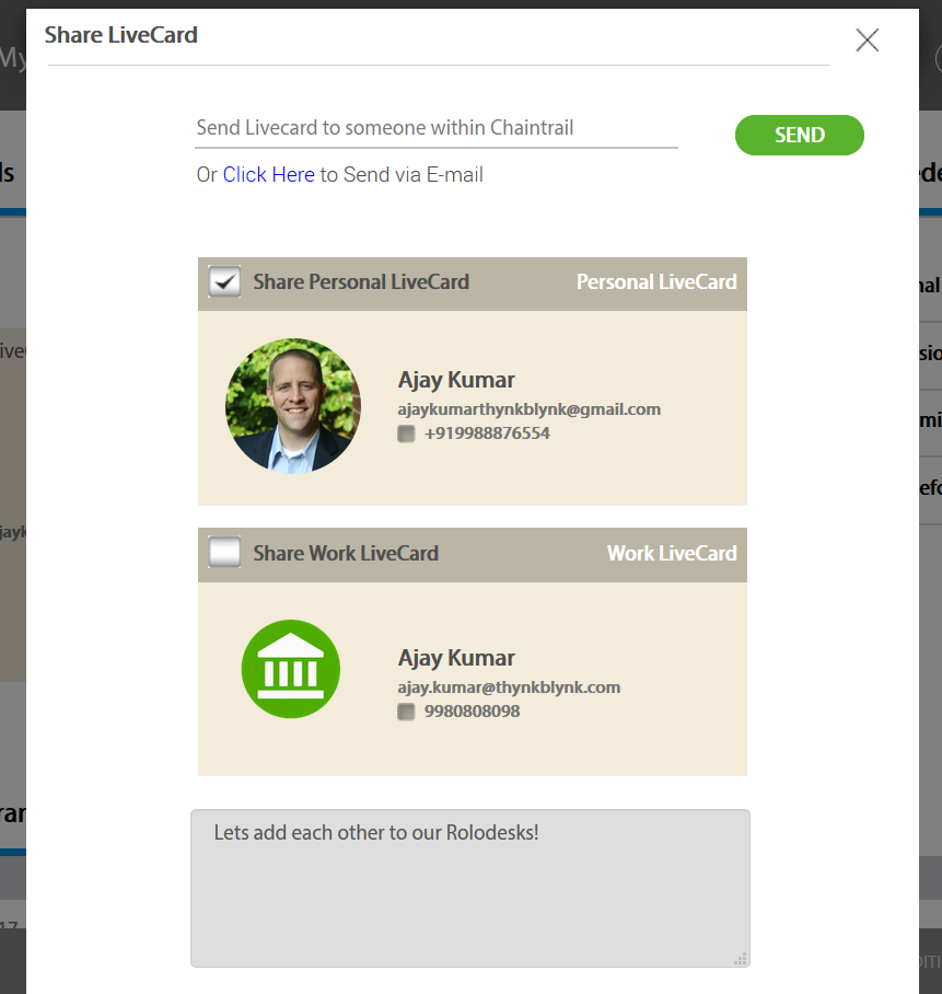 1. Exchange LiveCards: LiveCards and RoloDesk are a great way to digitally exchange and store contact information with your professional & personal network within or outside Chaintrail.Com. Its free for life!