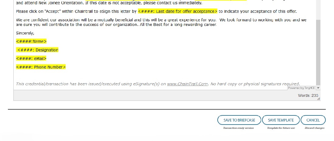 - In the organization’s Repository, employees can pick any template and edit it by inputting data as required and save a ‘Action Ready’ PDF document in their Briefcase.