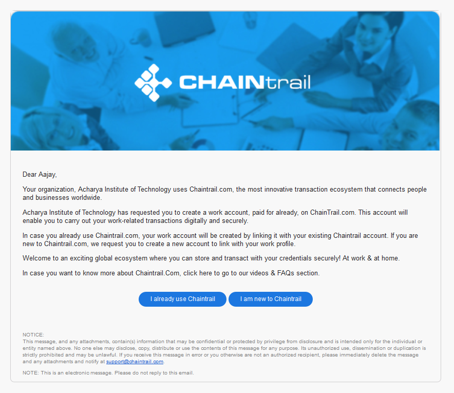 Once your personal account is created, you can go ahead and create your work account. Please go to the eMail received from ChainTRAIL.Com initiated by your organization’s administrator and click on the link provided within.